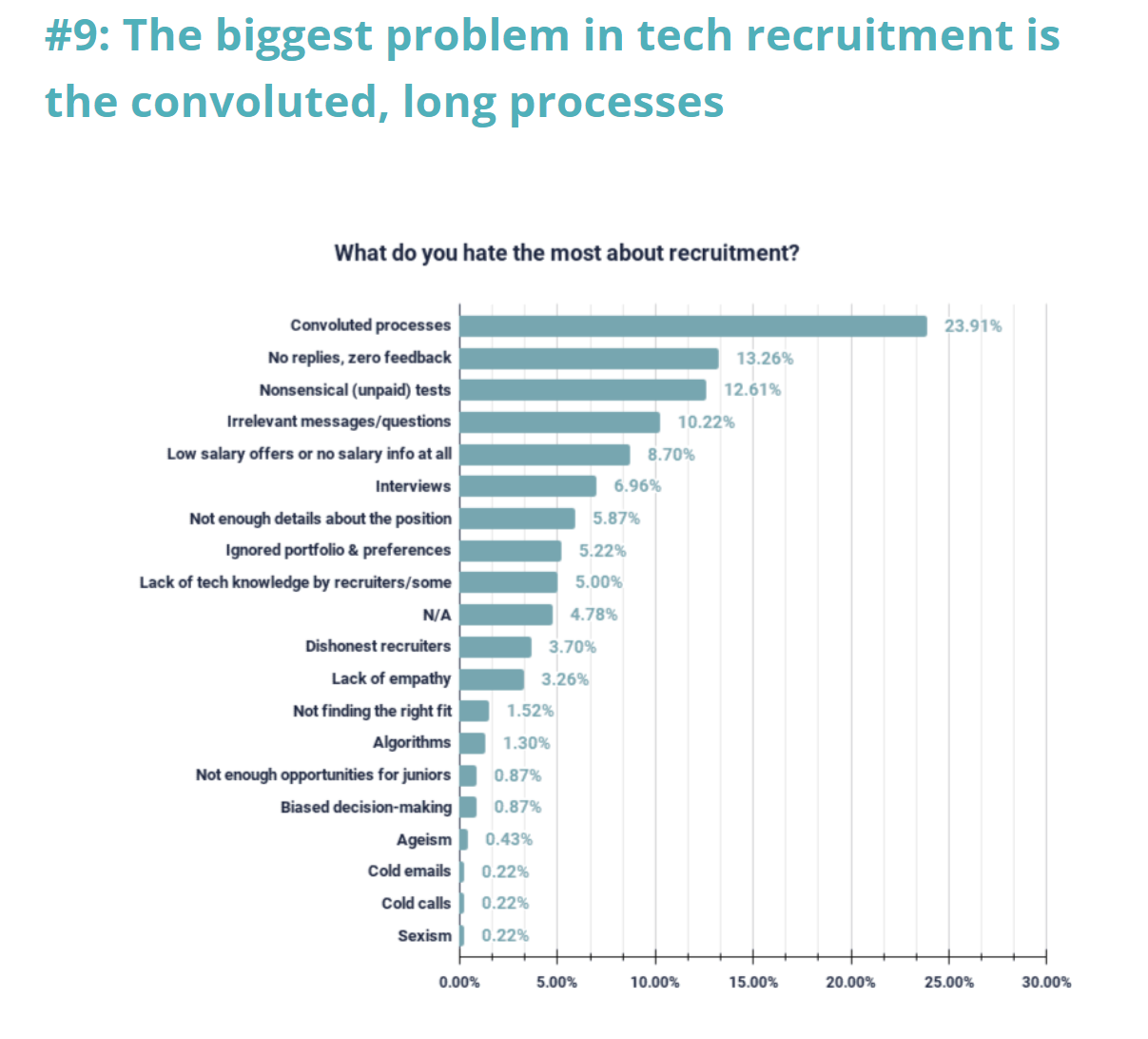 A mayor cantidad de pruebas/ entrevistas/ reuniones, más posibilidades hay de que un candidato se caiga del proceso. Los tiempos nunca son exactos, pero tener a un candidato más de 3 semanas en un proceso hace que pierda esperanzas e interés. |